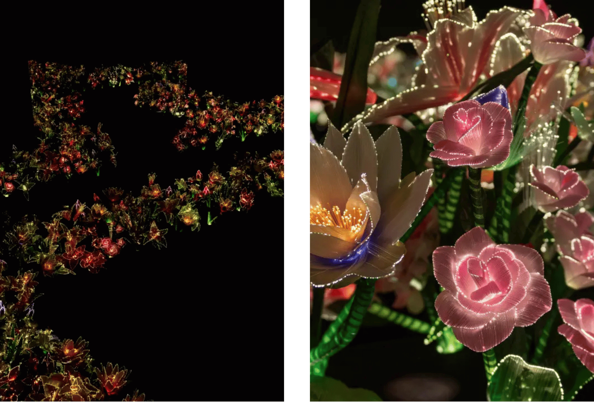 Você é literalmente guiado pela luz emitida por flores artificiais, enquanto o funcionamento mecânico da própria obra cria uma paisagem sonora que aprofunda a imersão.