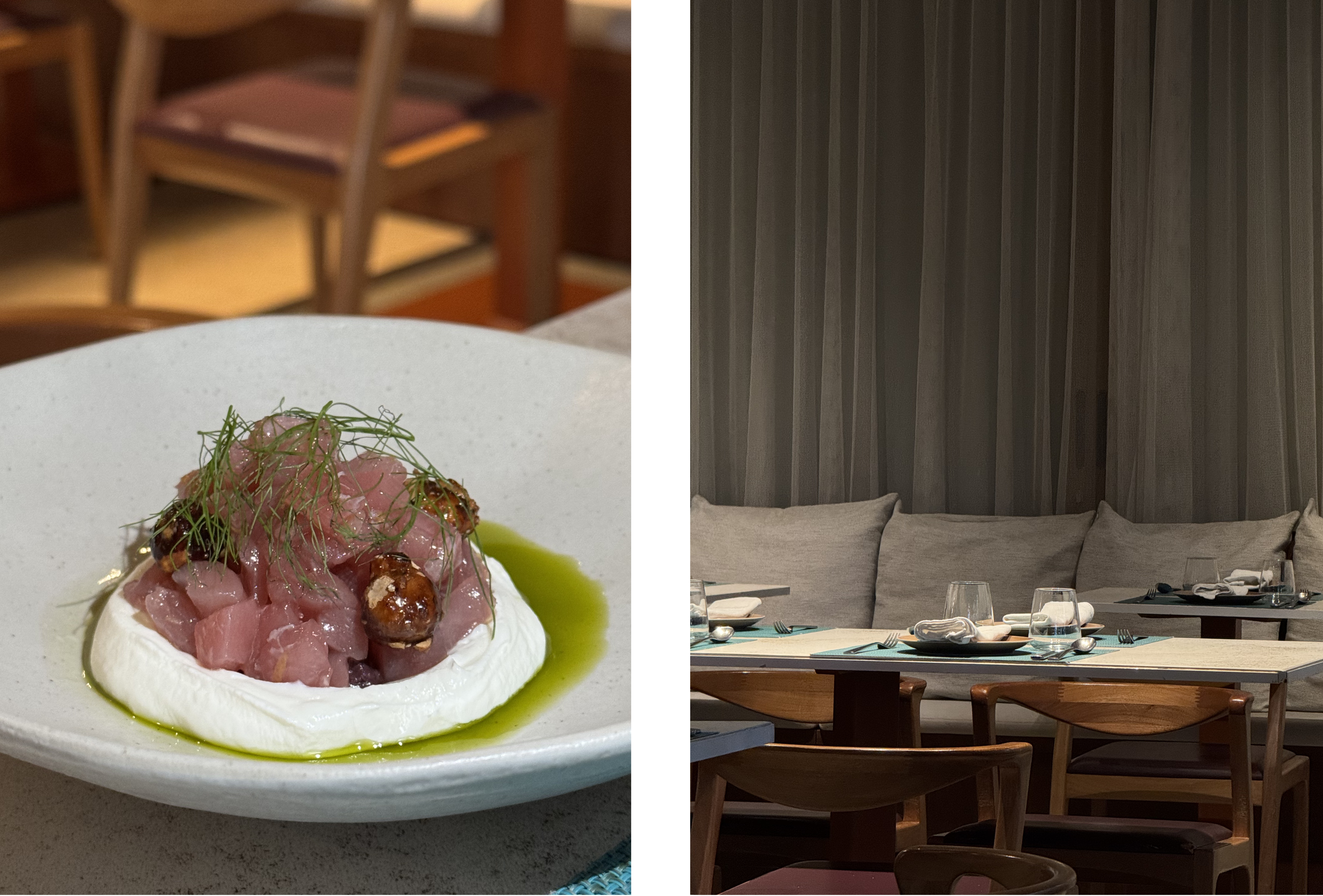 🍅 Tartare de atum com coalhada, pasta de tomate assado, azeite de manjericão e avelã;