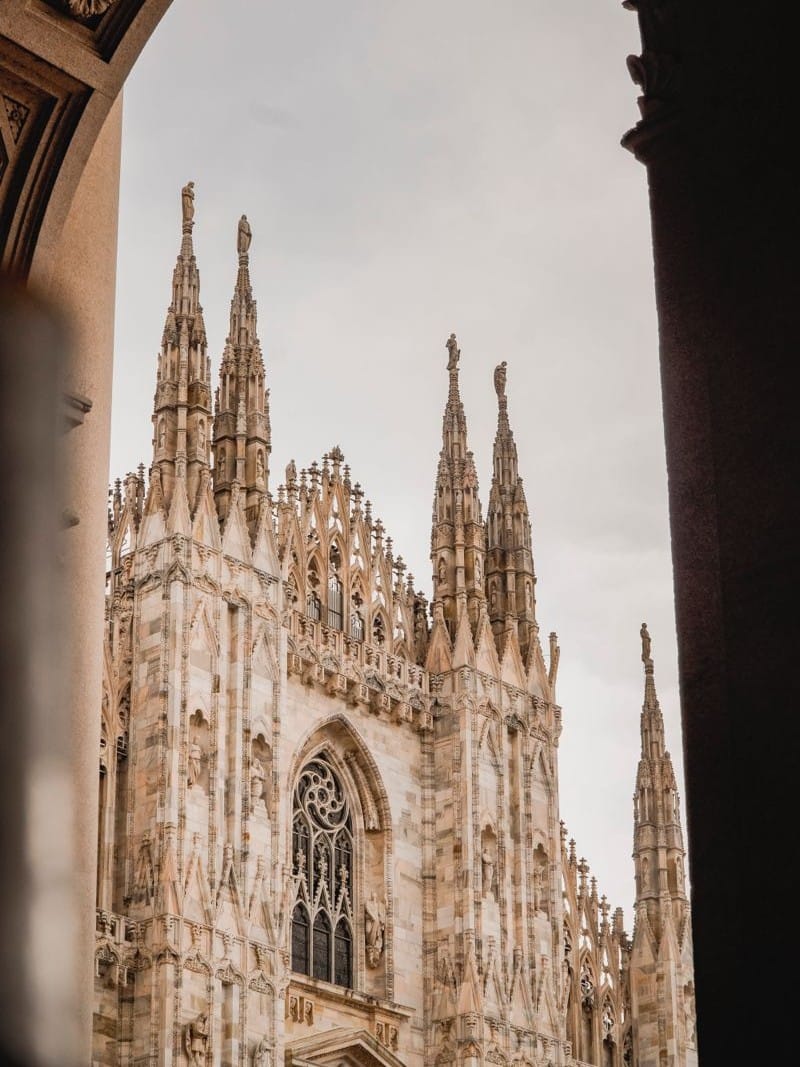 O Duomo di Milano é o cartão postal da cidade. Levou quase seis séculos para ficar pronto e é uma das catedrais góticas mais impressionantes do mundo: mármore branco-rosado, mais de 3.400 estátuas e uma floresta de flechas e pináculos que parecem desenhados a lápis contra o céu.